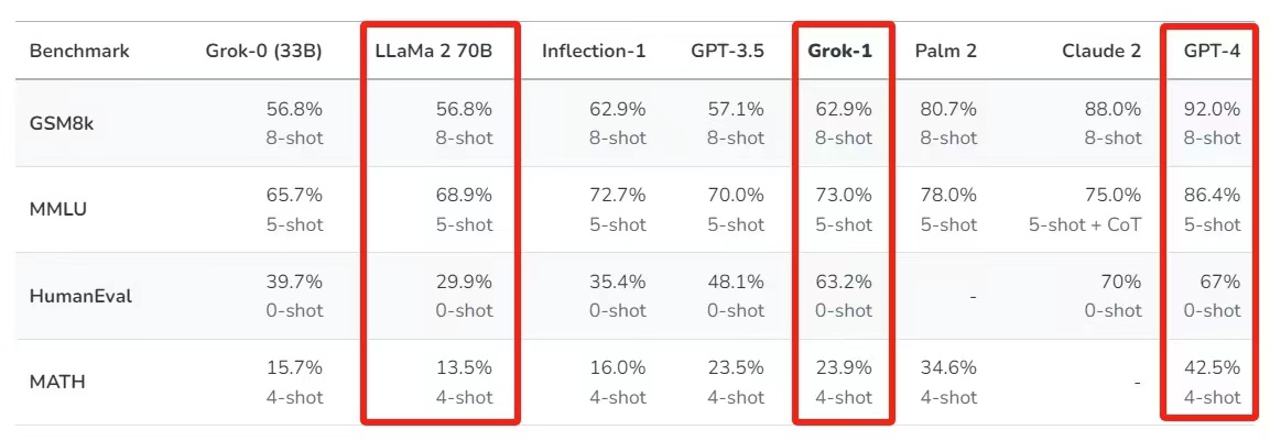 据悉,马斯克的AI团队在7月成立后,先花了一个月时间搞出了Grok-0大语言模型,随后又花了两个月时间迭代至Grok-1。通过多项大语言模型测试显示,Grok-1在多项测试中已经能稳稳压过Meta开源大模型LLaMa 2,距离GPT-4还有一段比较明显的差距。
